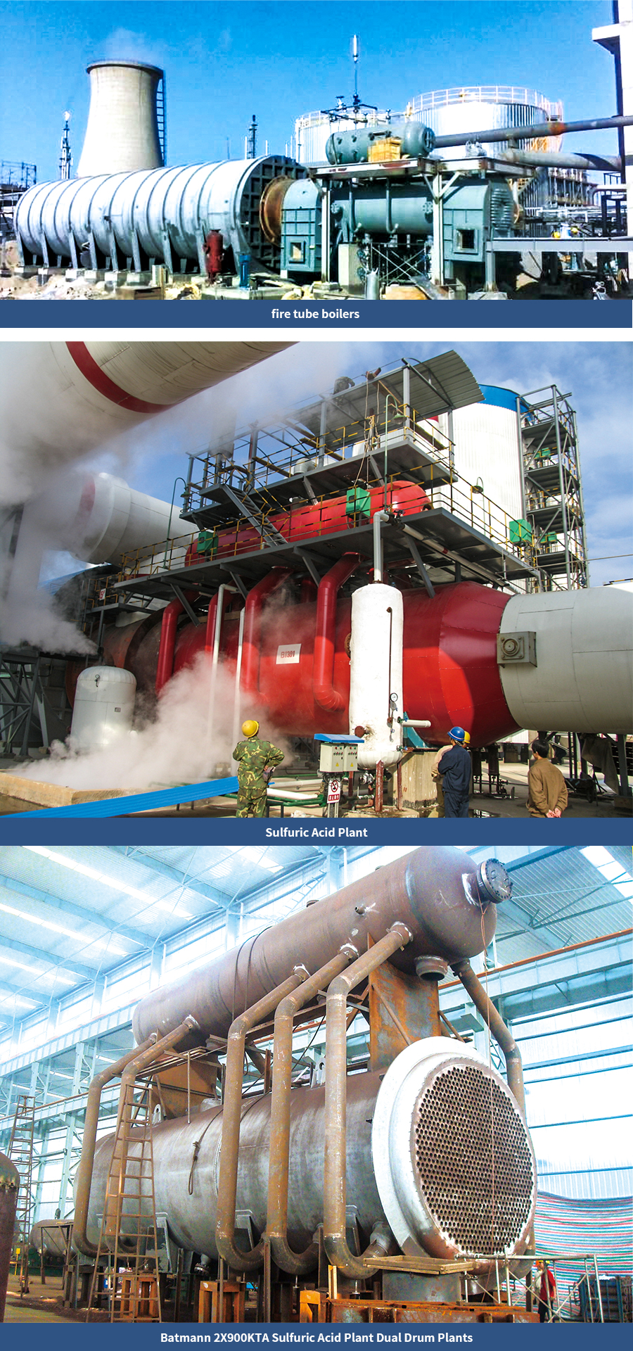 WHB systems for sulfur acid plants feature fire tube boilers, super-heaters and economizers, which are designed and manufactured in accordance with Boiler Regulations or Pressure Vessel Regulations. HLHI can supply all sets of systems with the optimum solutions.Invested with unique technologies, the safety of fire tube boilers, super-heaters, economizes, and the service life are far better than those of the domestic competitors’.